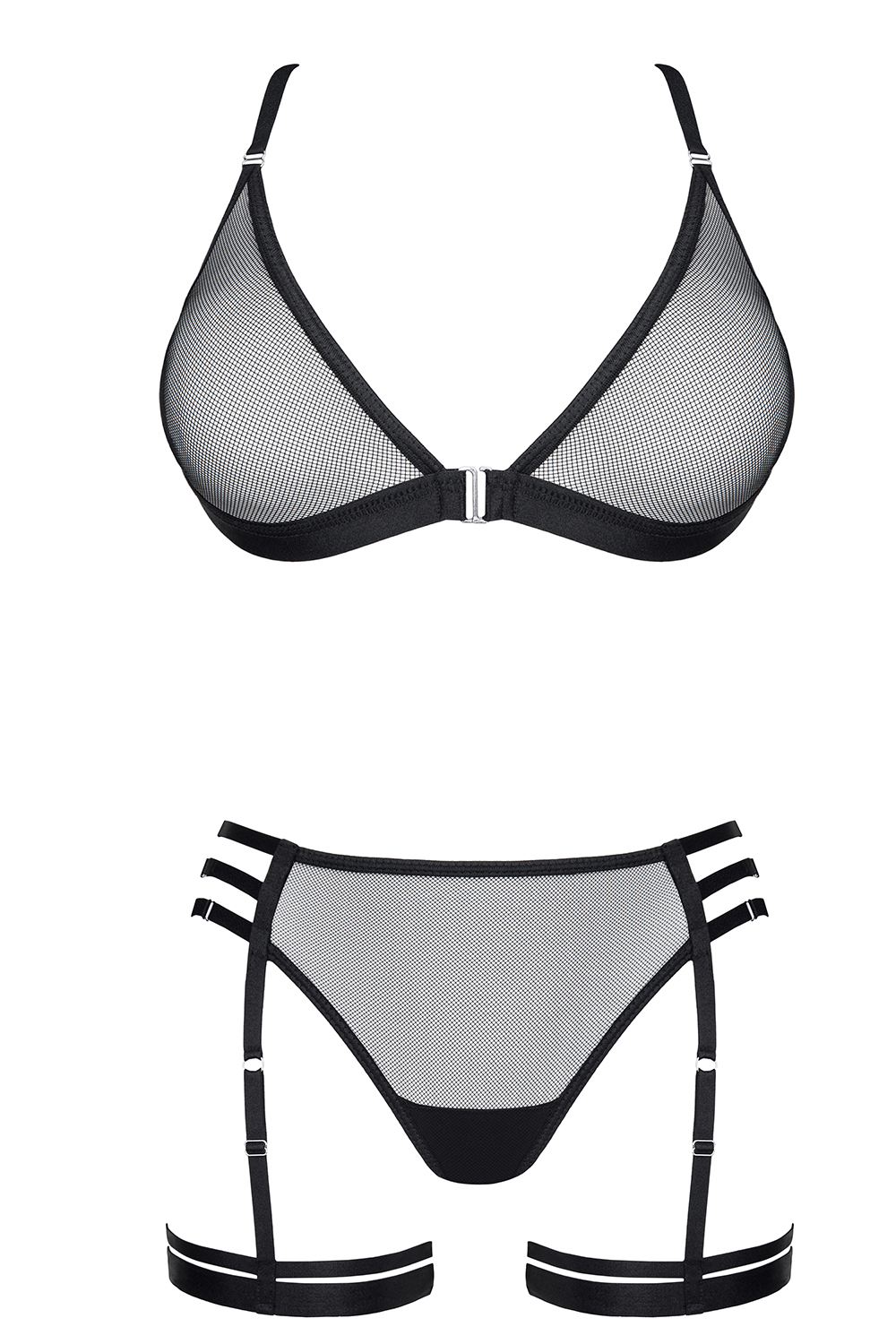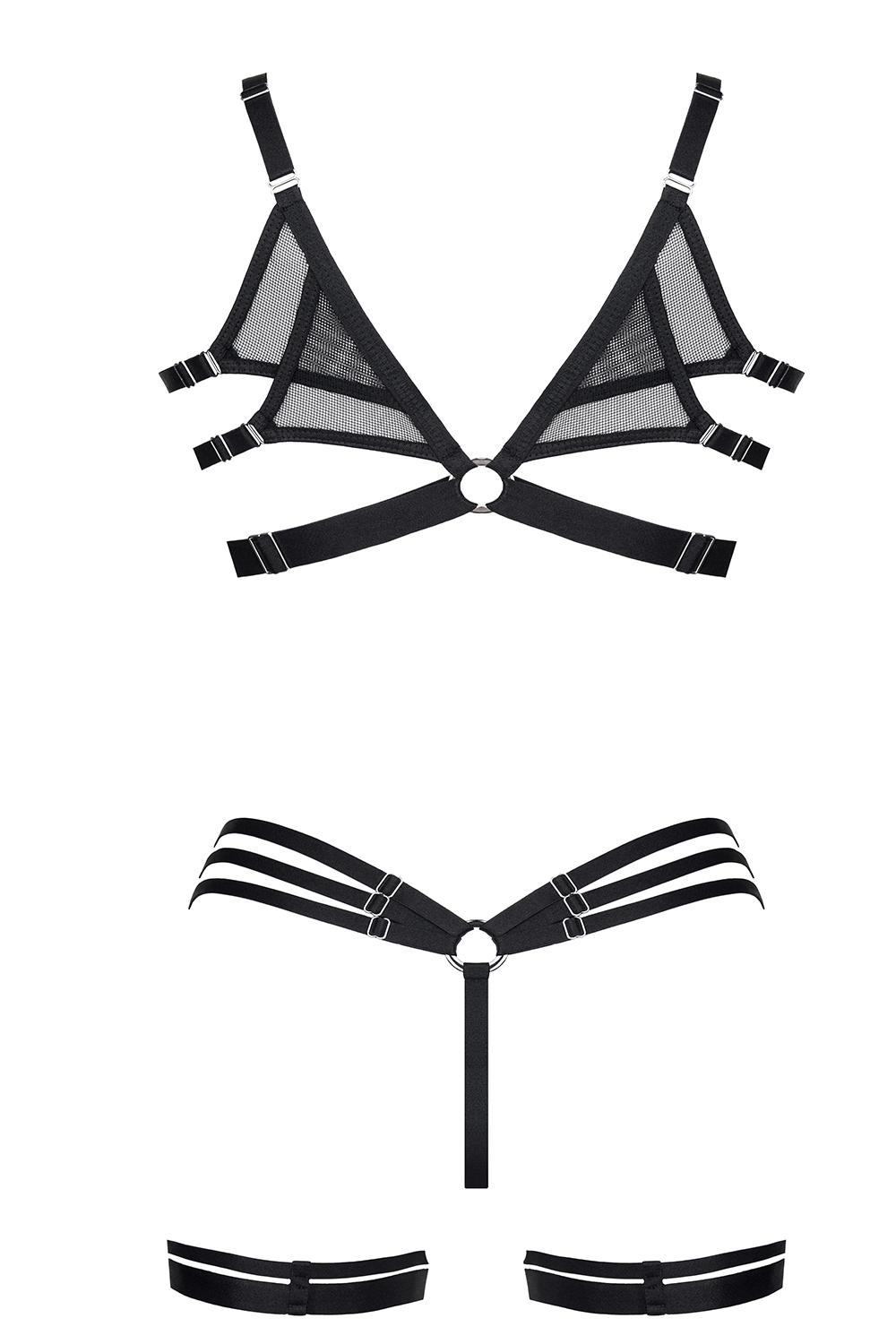 ‘- The set includes a bra, thong with impressive compositions of elastic bands and decorative elements, and garters.- Durable, decorative metal elements in silver – without the addition of chrome and nickel. .- Front bra: silver, metal, decorative clasp, transparent cups. At the back, there is a decorative composition of rubber bands with silver metal regulators.- Thongs at the front connected with garters. At the back, impressive rubber bands with metal, and decorative regulators in silver. Thanks to them, the set can be perfectly adapted to the body.