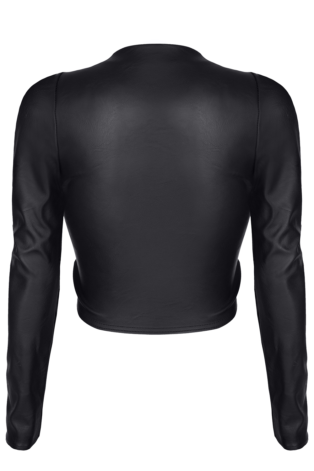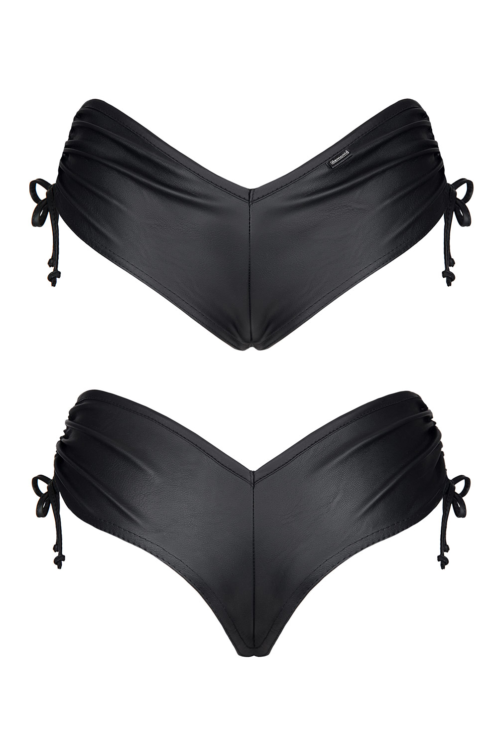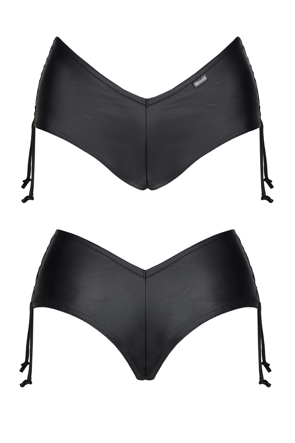 ‘-Top made of elastic eco-leather, with long sleeves and a drawstring at the front.-Drawstrings allow various ways to emphasize the neckline and the shape of the breast.-By tightening the strings tightly, the triangle-shaped neckline looks exceptionally impressive. Loosely tied make it a sexy T-shirt with a covered part of the stomach.-Shorts made of elastic eco-leather. Profiled triangle shape at the front, drawstrings at the sides.-At the front and back, they are distinguished by the shape of triangles in the waistline, and vertical drawstrings on the sides.-From the back, the look of the alluring buttocks, is emphasized by a specially profiled cut.
