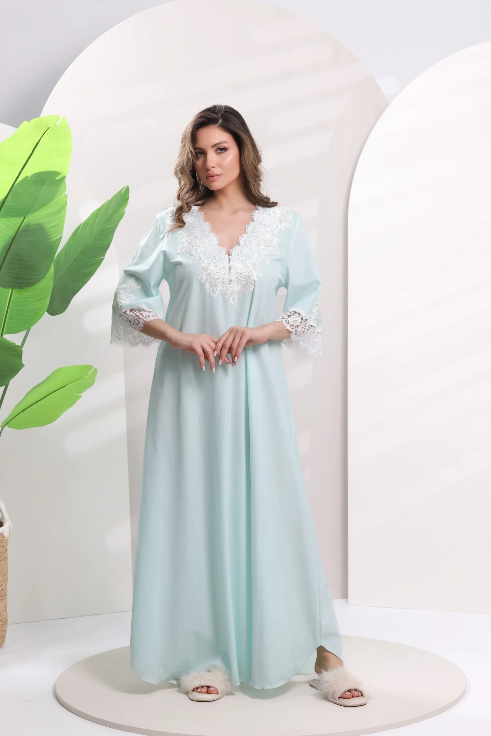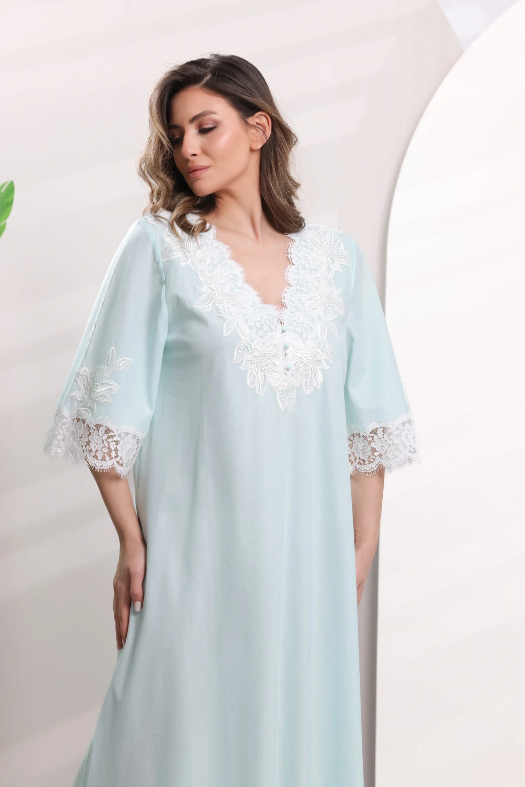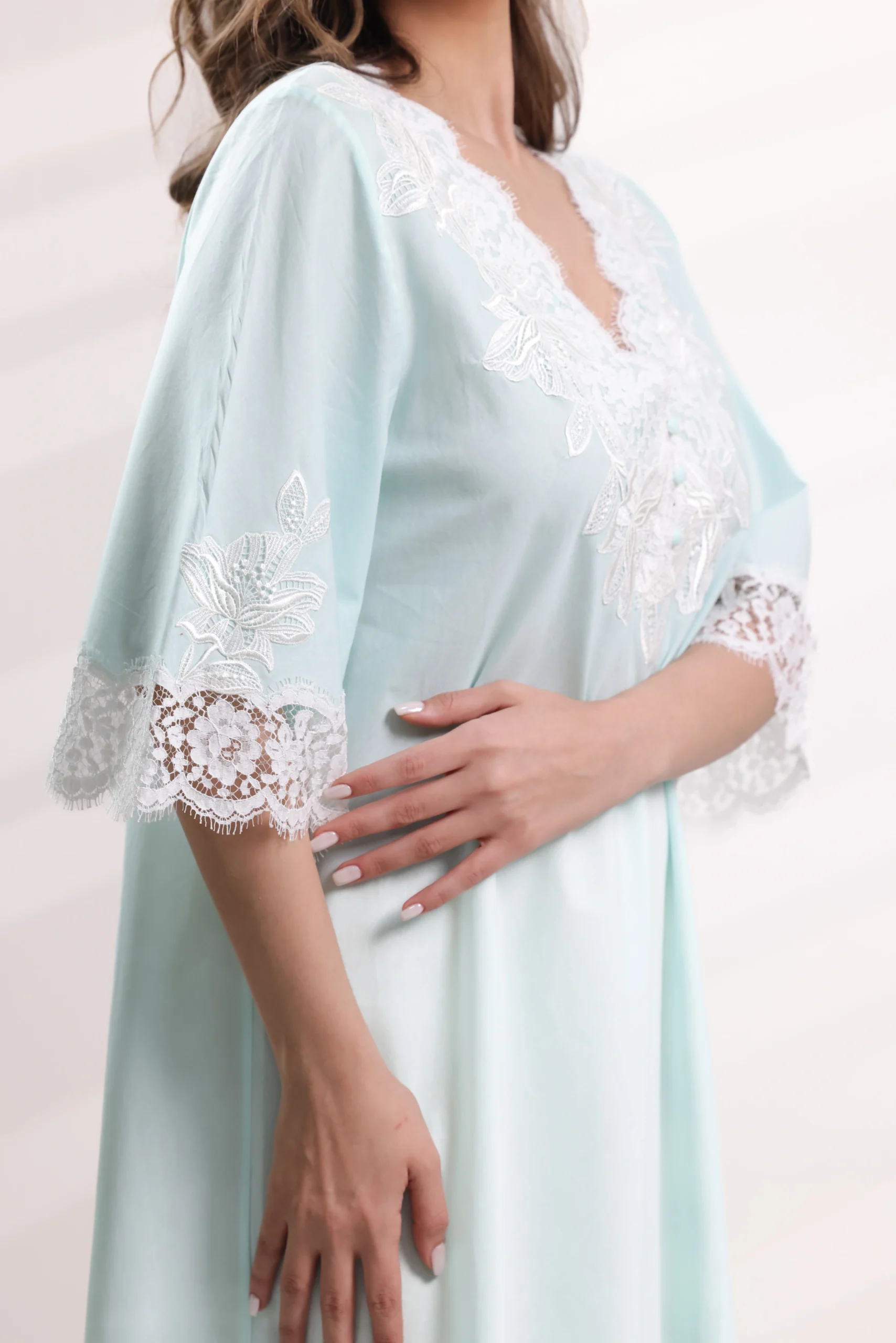 ‘- Elegant nightgown hand finished with a double-frastaglio technique and floral leavers lace inserts.- Nightgown in pure style finely embroidered hand-made lace and soft cotton.
