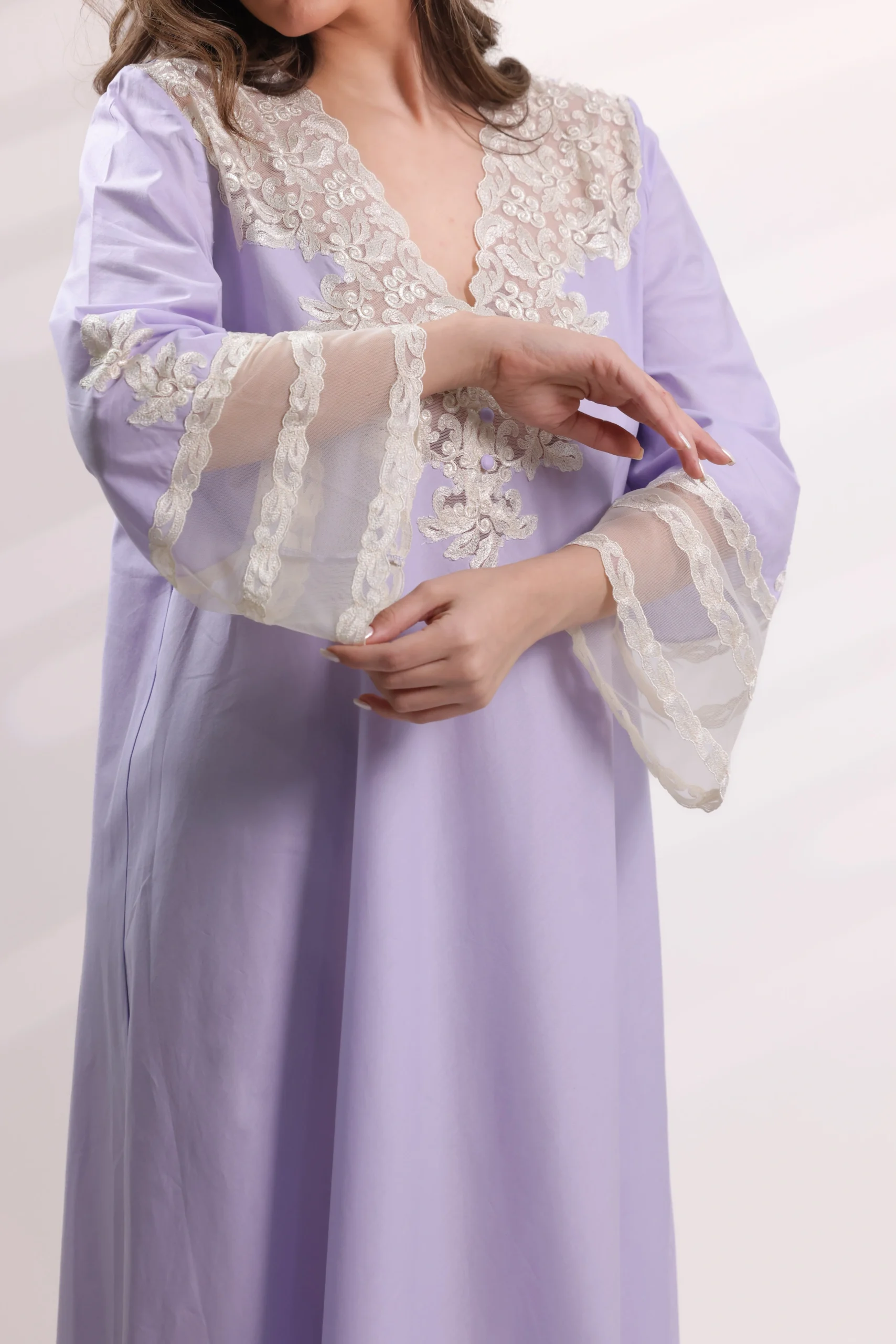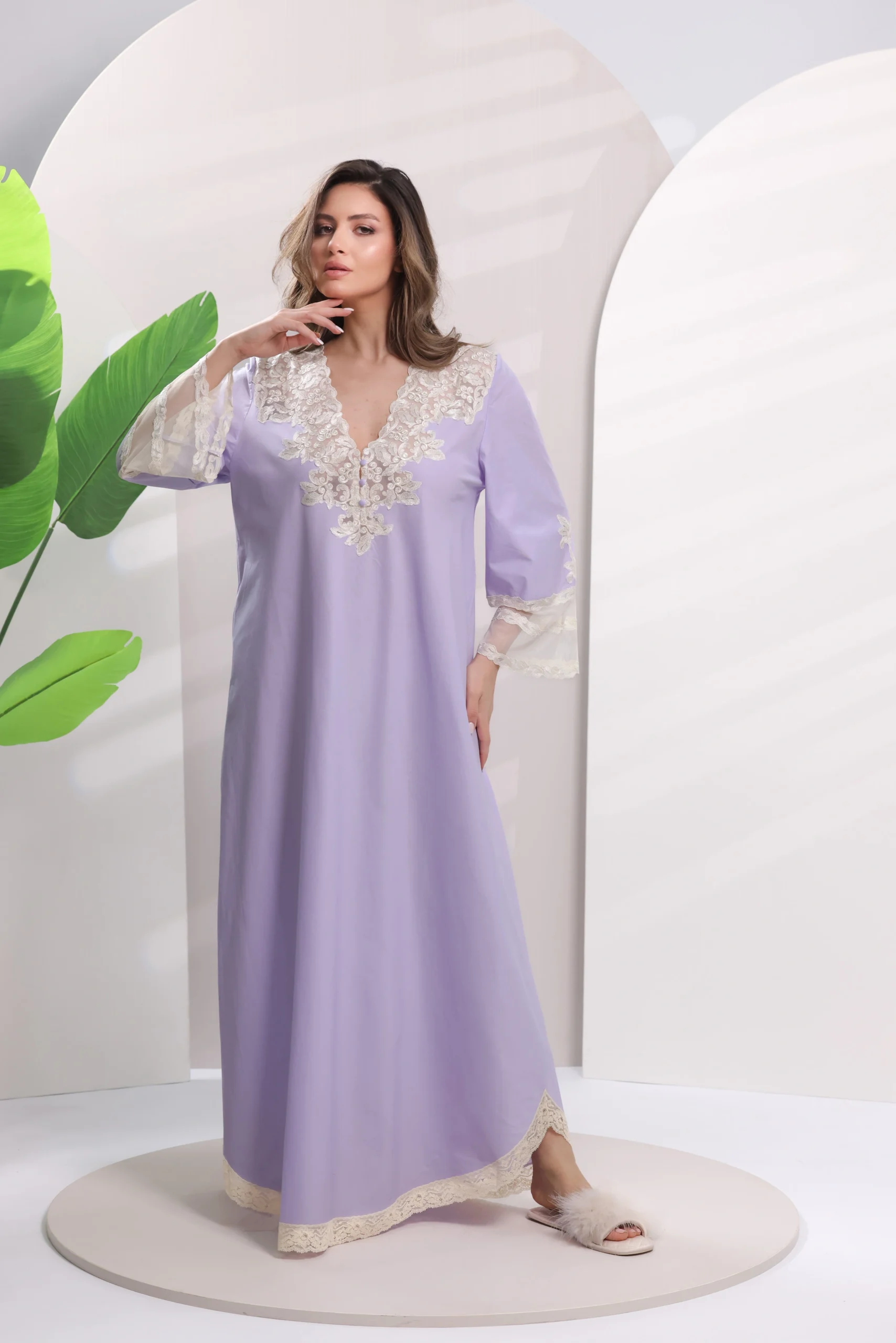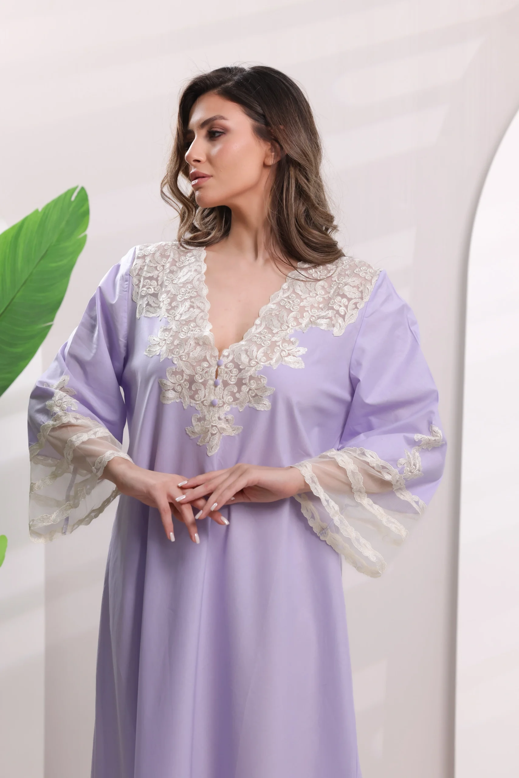 ‘- Elegant nightgown hand finished with a double-frastaglio technique and floral leavers lace inserts.- Nightgown in pure style finely embroidered hand-made lace and soft cotton.